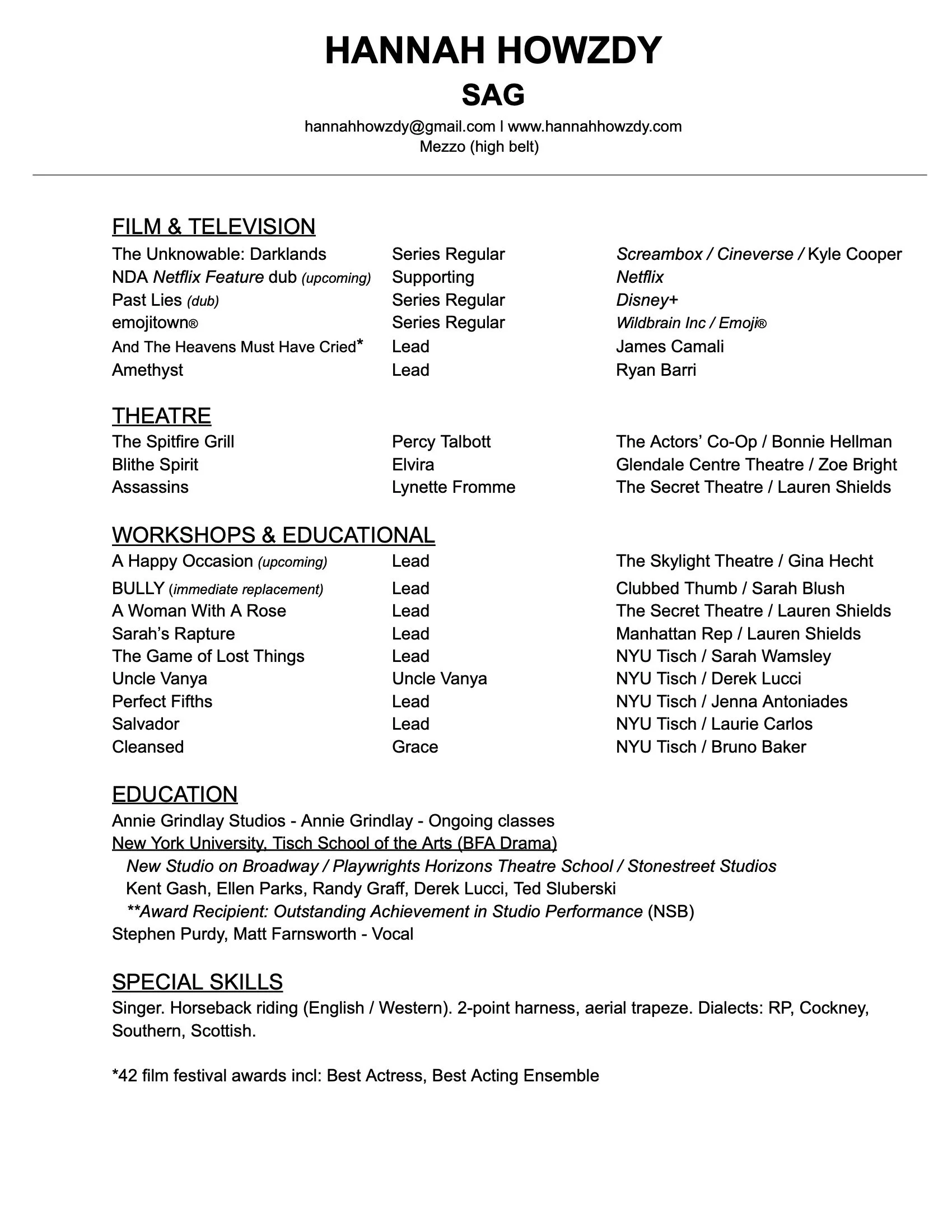 “Hannah Howzdy portrayed the perfectly angry, wounded bird of Percy… she has a wide singing range, as well as a beautiful voice.” - Chris Cassone for Discover Hollywood on The Spitfire Grill